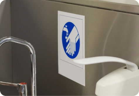 Sinalização com adesivos de identificação e cartazes com descrição dos processos de higienização, em locais estratégicos, para auxílio durante o processo de limpeza e higienização.